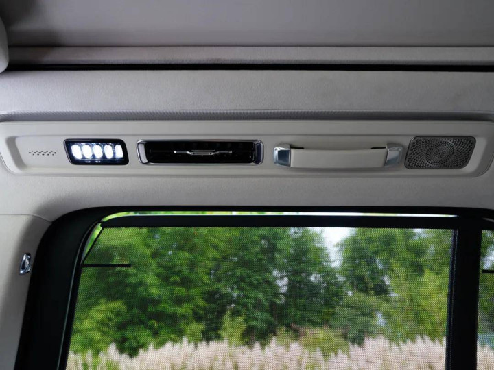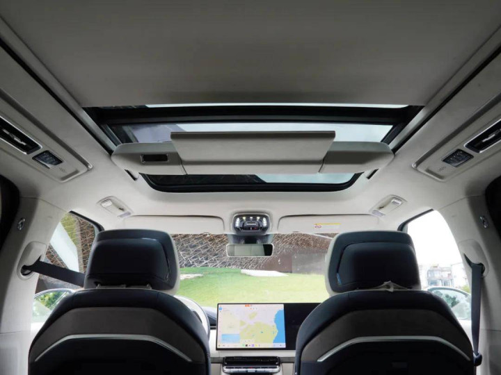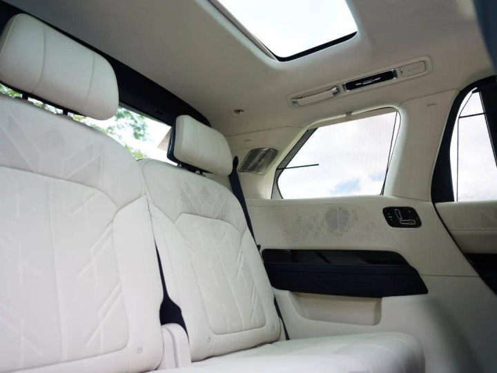 第三排也有座椅靠背角度电动调节、座椅加热、头顶音响、空调出风口、大面积侧窗、隐藏式/非隐藏式挂钩,甚至还有个带遮阳帘的天幕,空间和舒适度都没得挑: